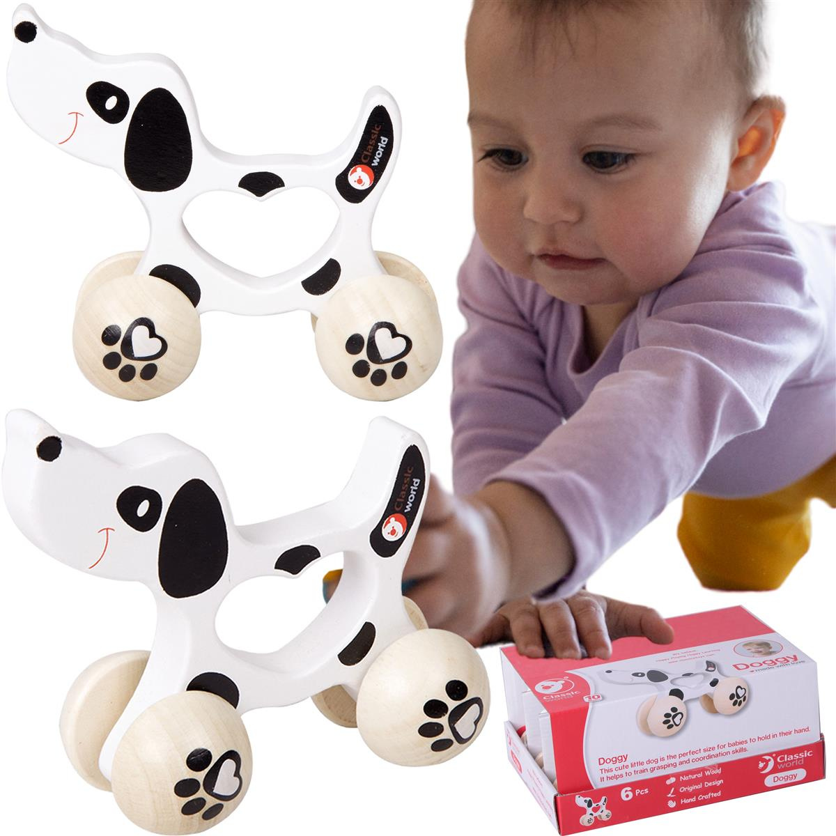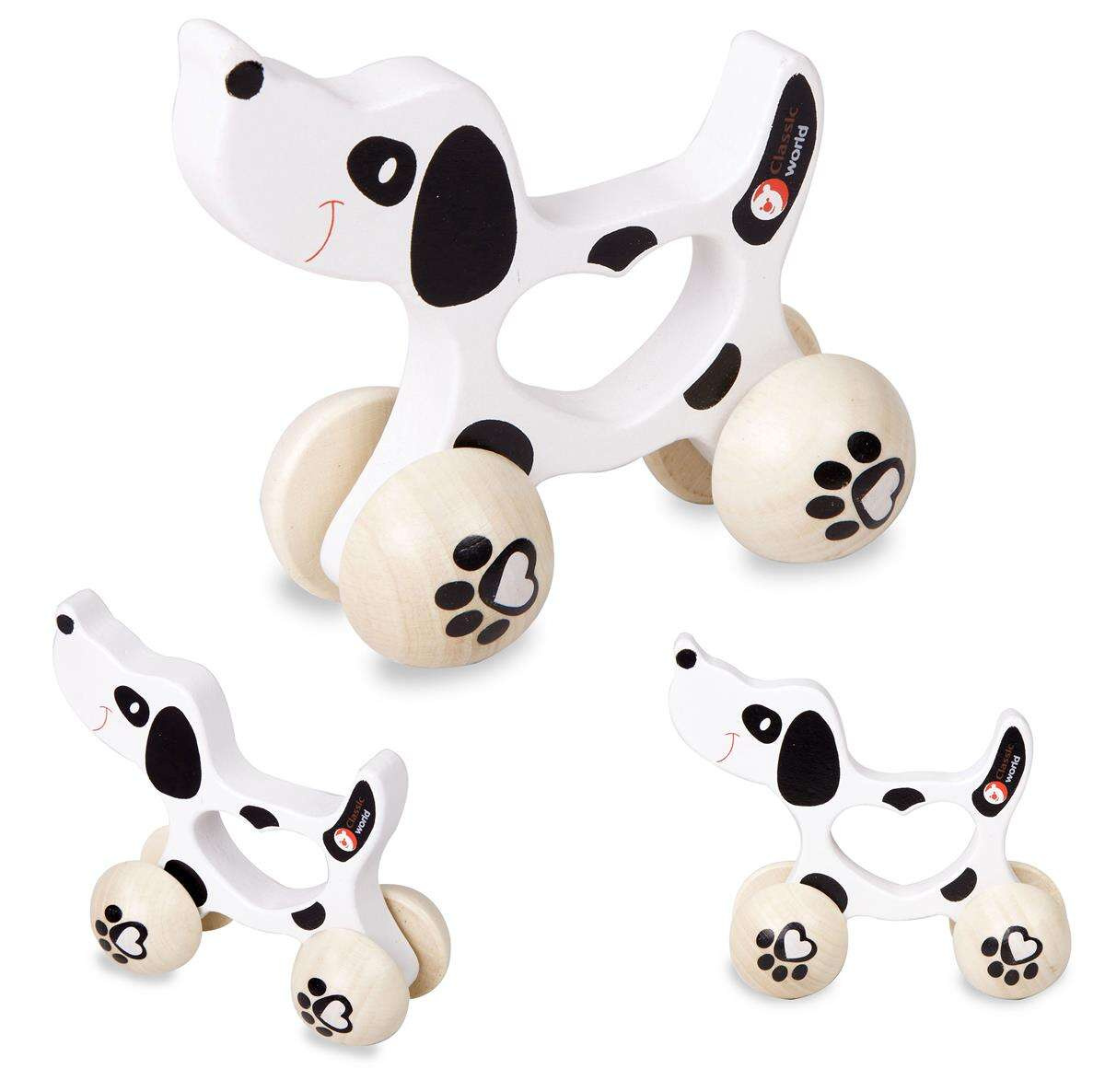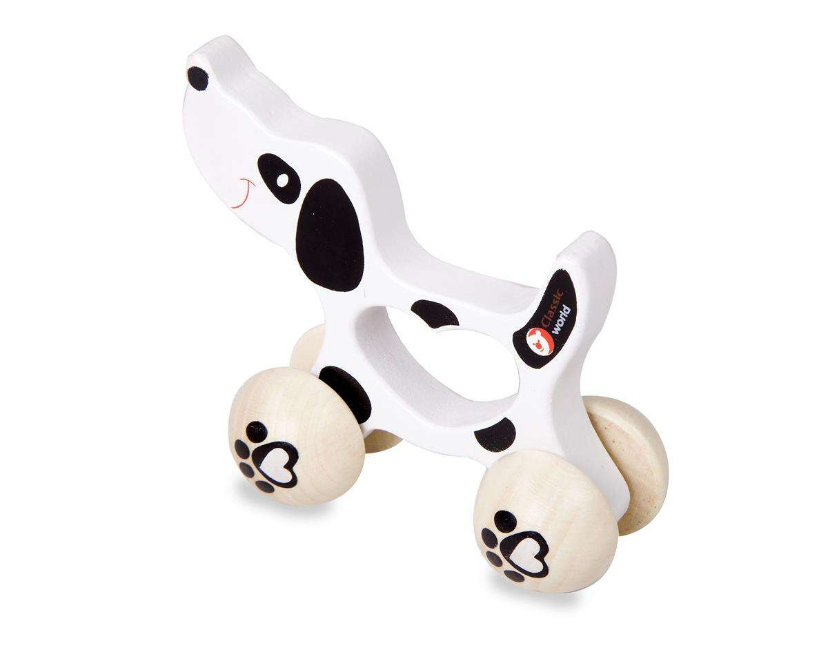 Bestsellerowa zabawka marki Classic World. Drewniana pchanka - piesek dalmatyńczyk to wspaniały prezent dla dziecka w wieku od 10 miesięcy. Rozmiar pieska dostosowany został do wielkości dziecięcych rączek, dzięki czemu korzystanie jest łatwiejsze i wygodniejsze. Zabawka rozwija u dziecka wiele przydatnych umiejętności.