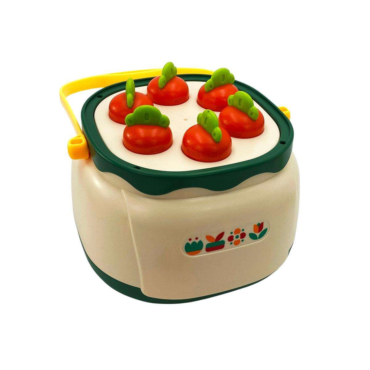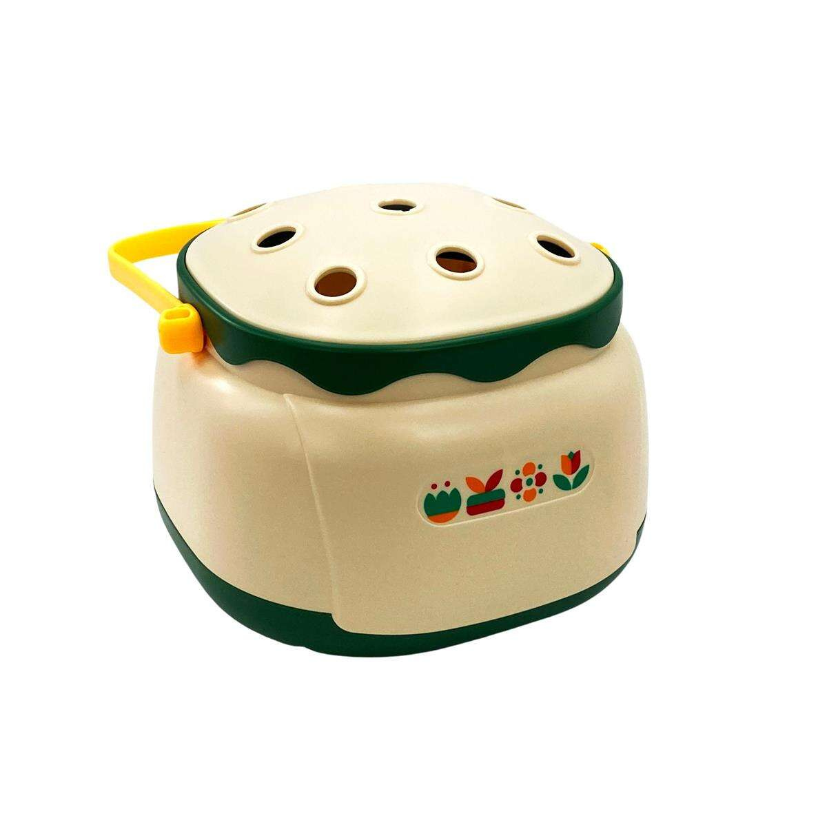 - Plastikowy kosz z rączką na którym umieszcza się nakładki do sortowania, jest to także praktyczny i estetyczny pojemnik do przechowywania wszystkich elementów zestawu.