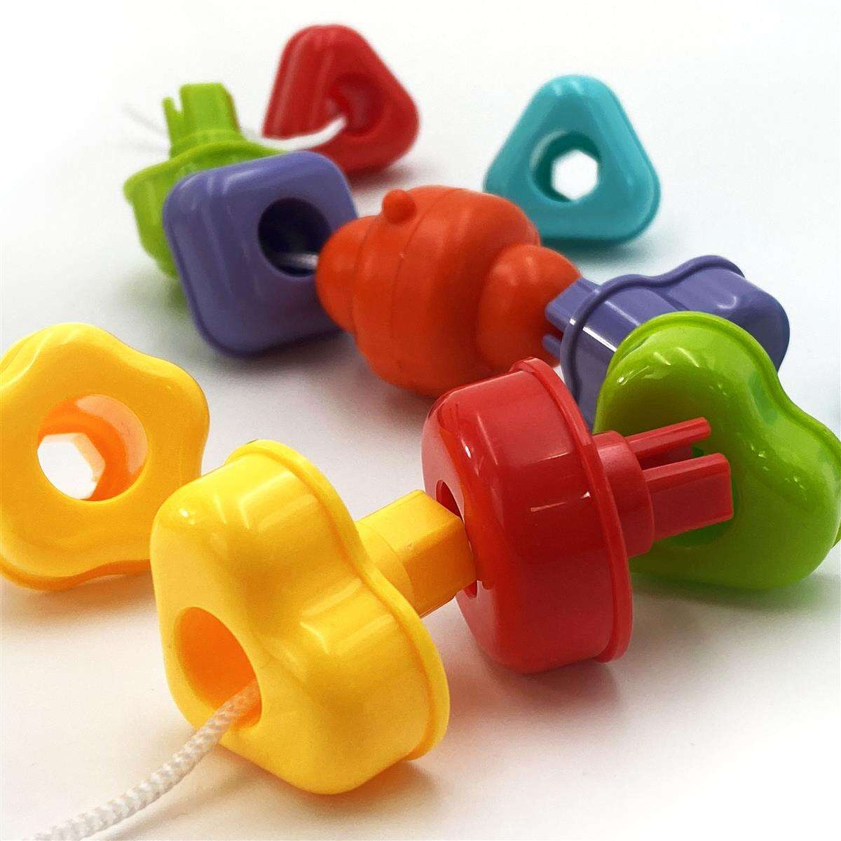 - Sznurek do nawlekania elementów umożliwia dziecku nawlekanie różnych części zestawu. To ćwiczenie rozwija zdolności manualne, koordynację ręka-oko oraz koncentrację.