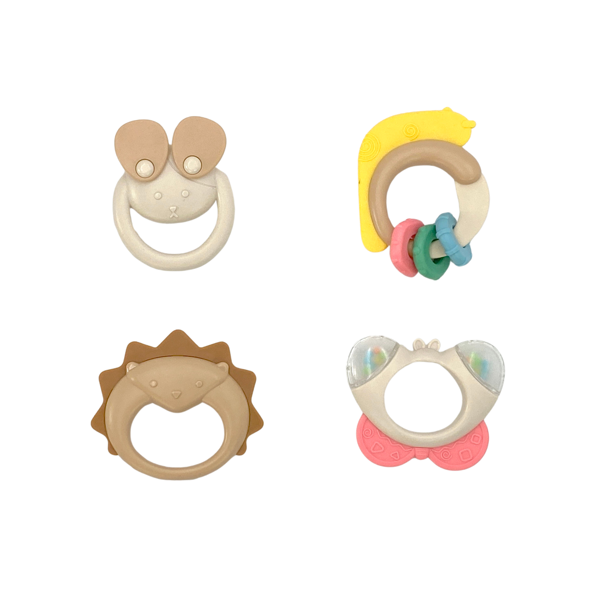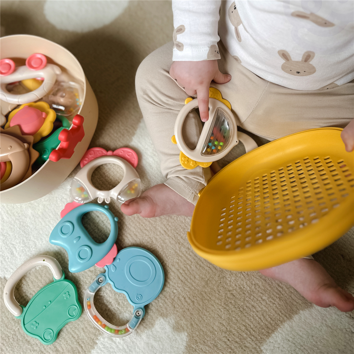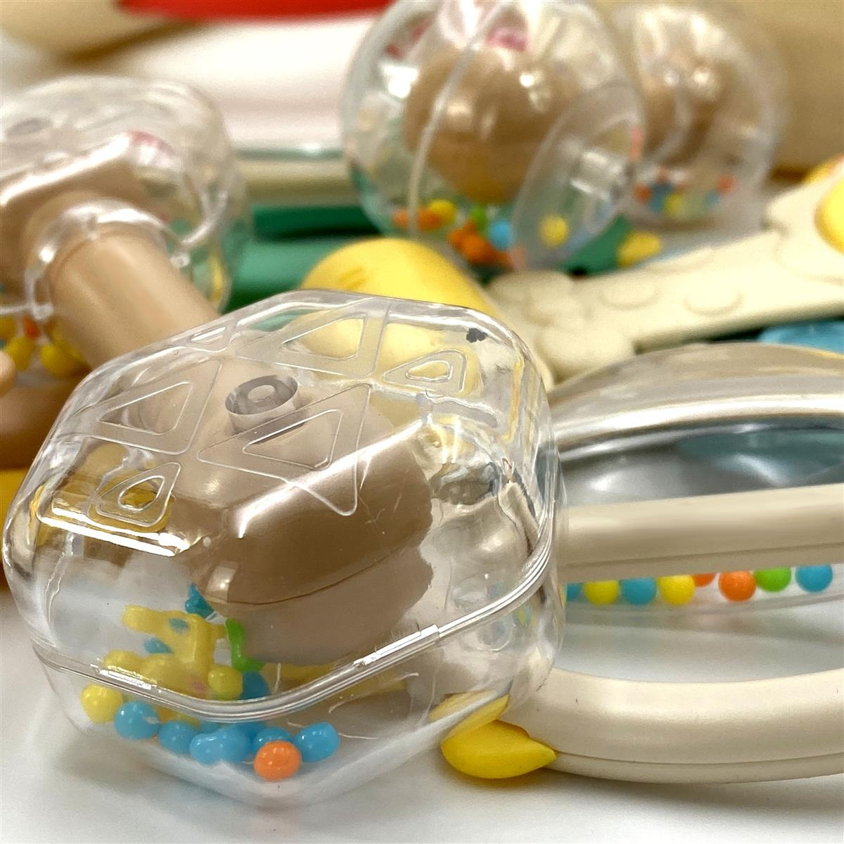 - - zestaw zawiera różnorodne grzechotki o różnych kształtach i fakturach,